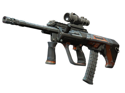Powerful and accurate, the AUG scoped assault rifle compensates for its long reload times with low spread and a high rate of fire. A custom paint job with gunmetal triangles and carbon fiber over a burnt orange base.