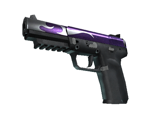 Highly accurate and armor-piercing, the pricy Five-Seven is a slow-loader that compensates with a generous 20-round magazine and forgiving recoil. A silver flame on the muzzle overlays a purple base with a metal flake finish.