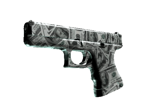 The Glock 18 is a serviceable first-round pistol that works best against unarmored opponents and is capable of firing three-round bursts. It has been painted using a hydrographic of American hundred-dollar bills.