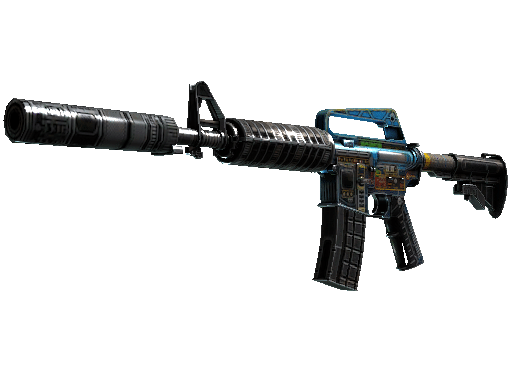 With a smaller magazine than its unmuffled counterpart, the silenced M4A1 provides quieter shots with less recoil and better accuracy. It has been hand painted with colorful dials and switches atop a blue base.