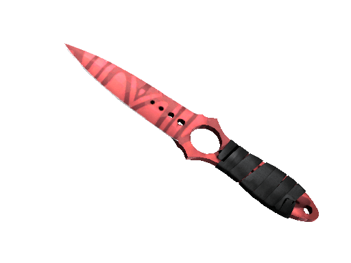 This skeletonized-tang knife has been taped at the handle for improved grip. The hole allows a finger to be threaded through for stability and safety. It has been painted in a zebra-stripe pattern with aluminum and chrome paints with various reflectivities, and has then been covered with a tomato red candy coat.